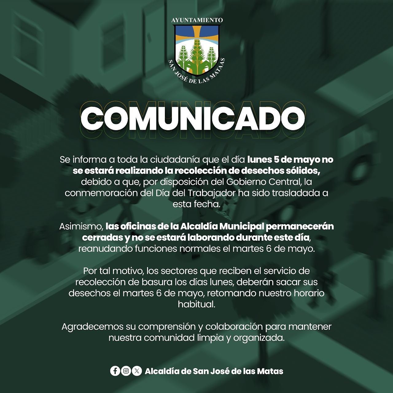 Este lunes 5 de mayo, la Alcaldía permanecerá cerrada y no se realizará la recolección de desechos sólidos.