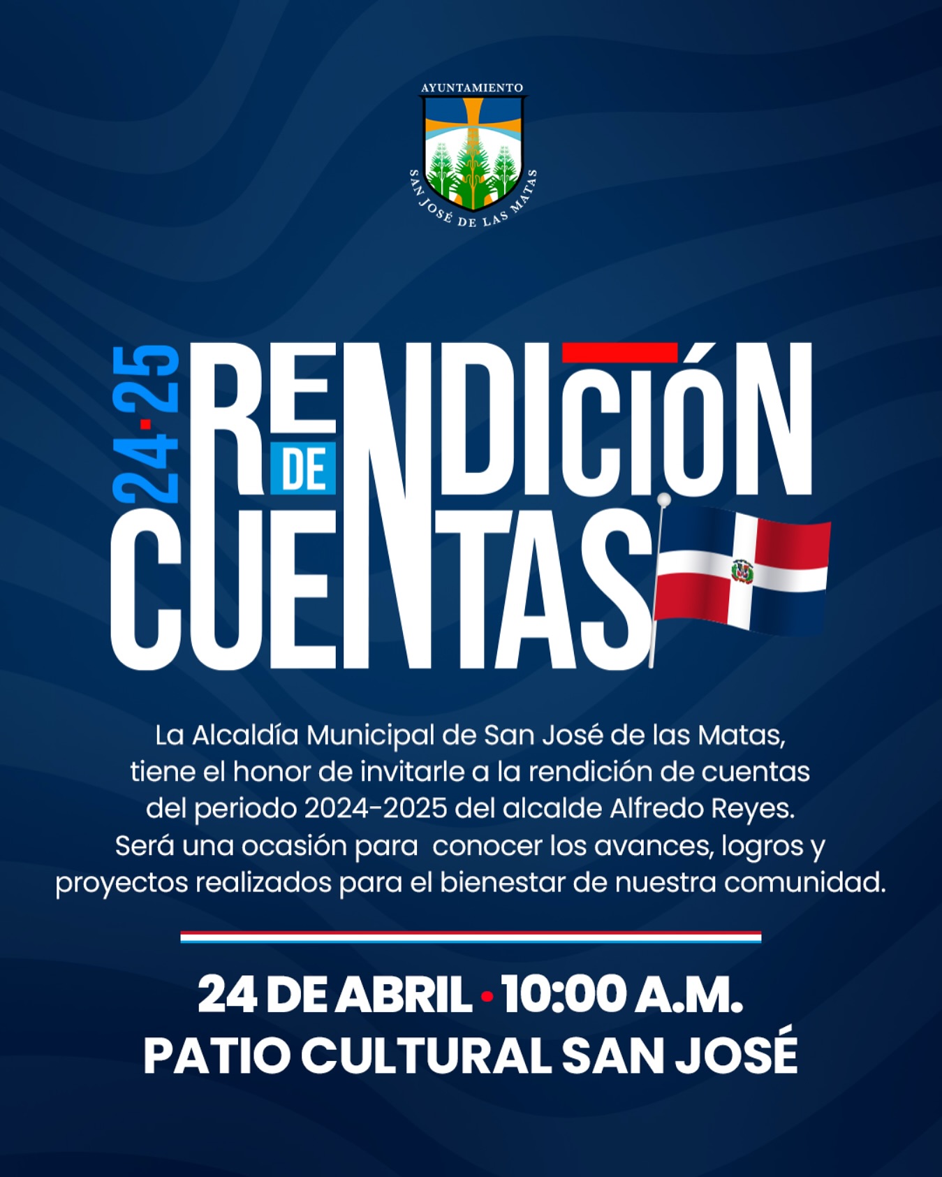 Invitamos a todo el municipio de San José de las Matas y zonas aledañas a la Rendición de Cuentas 2024-2025 del señor alcalde Alfredo Reyes, donde se mostrará con transparencia el manejo de los fondos destinados a nuestro municipio.