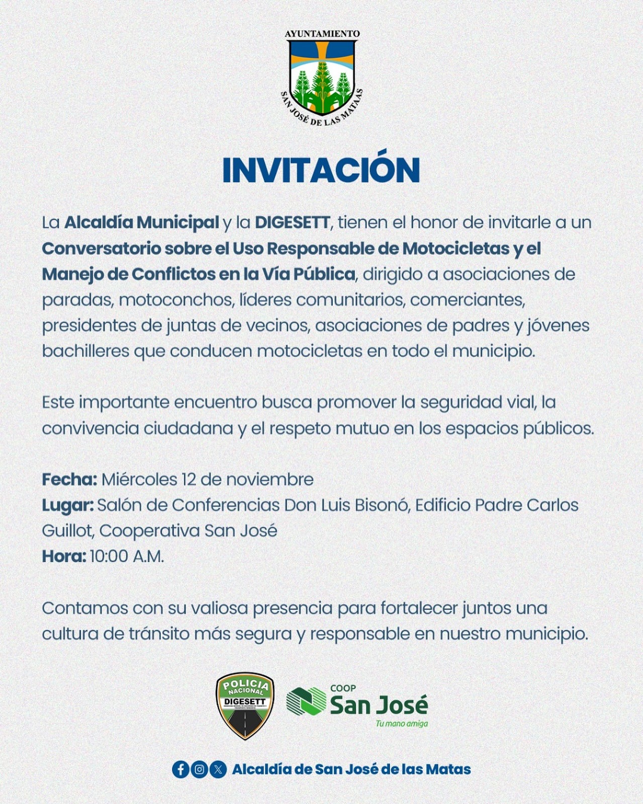 Convocatoria sobre el uso responsable de motocicletas y el manejo de conflictos en la vía pública.