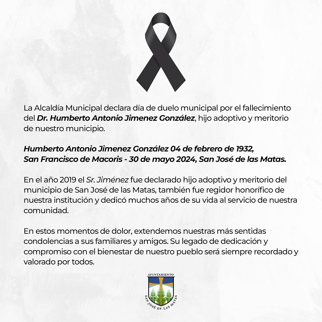 Declaramos día de duelo municipal por el fallecimiento del Dr. Humberto Antonio Jiménez González. Paz a su alma y conformidad a sus familiares y amigos.