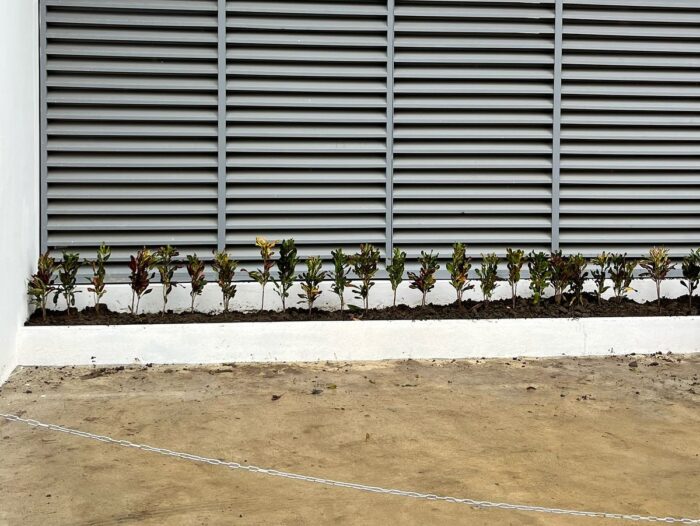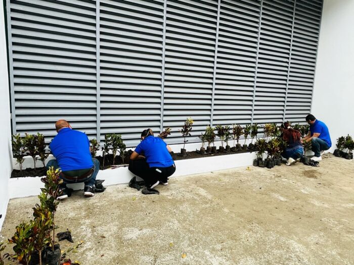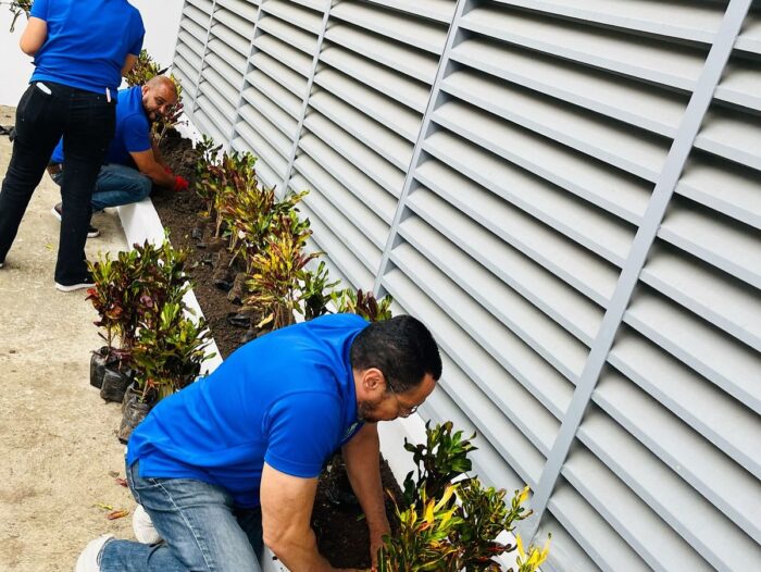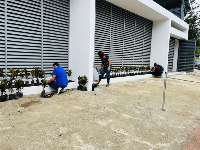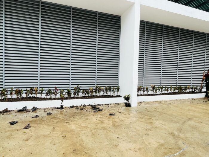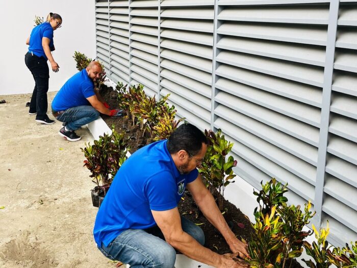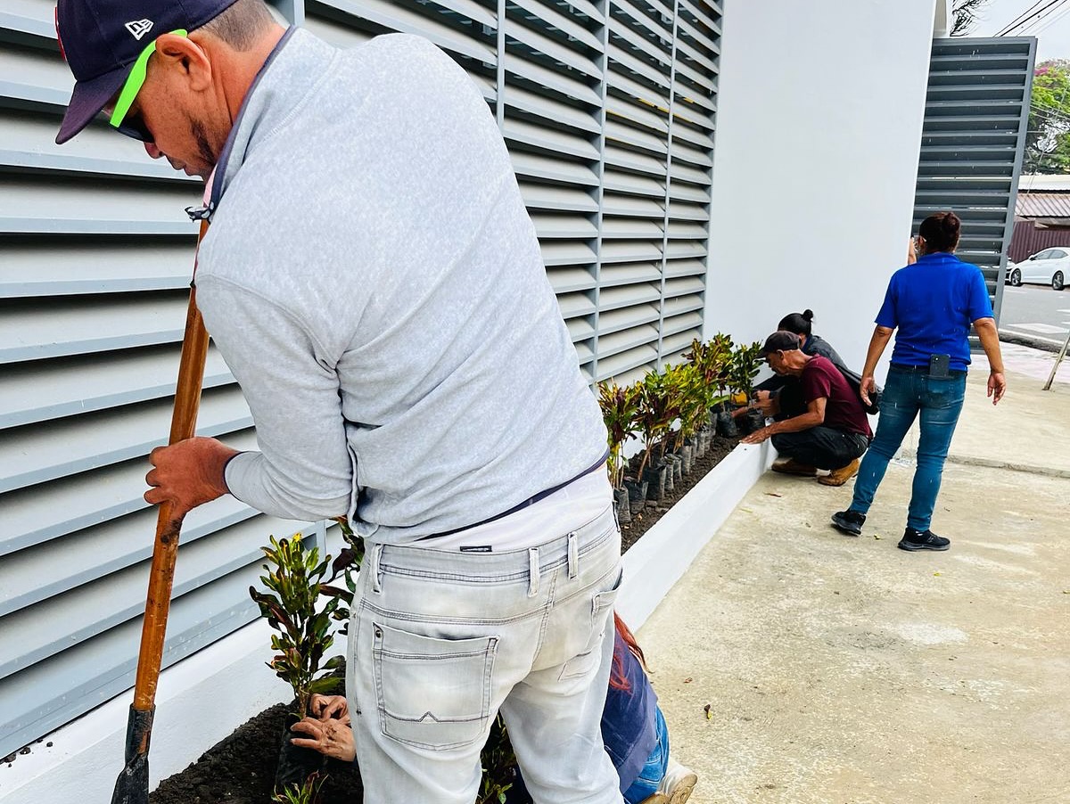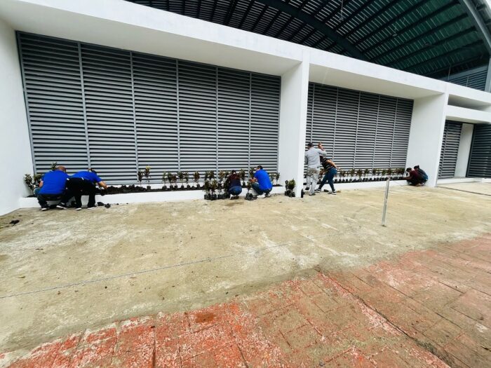 Empleados de la Alcaldía Municipal embellecen la fachada frontal de la renovada Cancha Municipal con la colocación de plantas ornamentales.