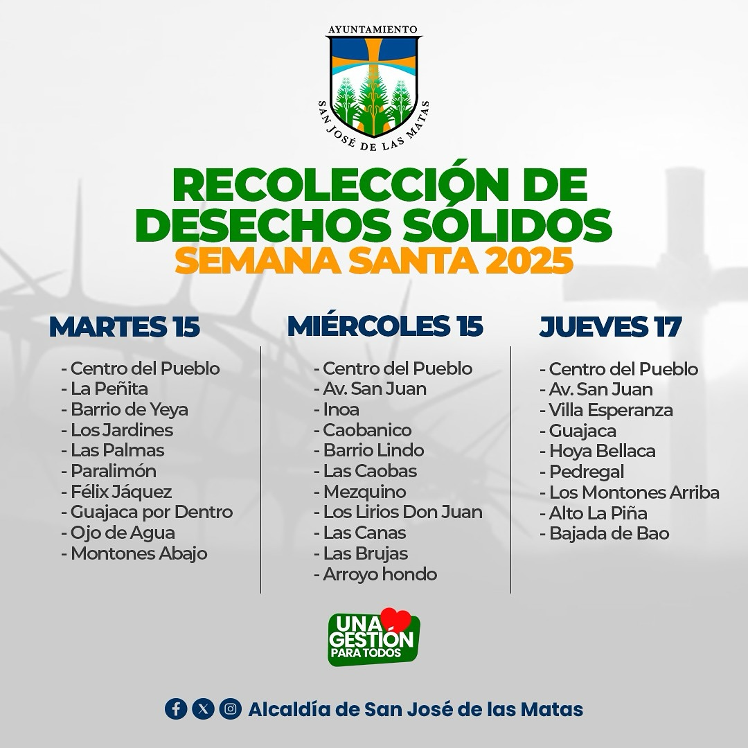 Horario especial de recolección de desechos sólidos en el municipio durante la Semana Santa 2025, promoviendo un entorno limpio y saludable para residentes y visitantes.