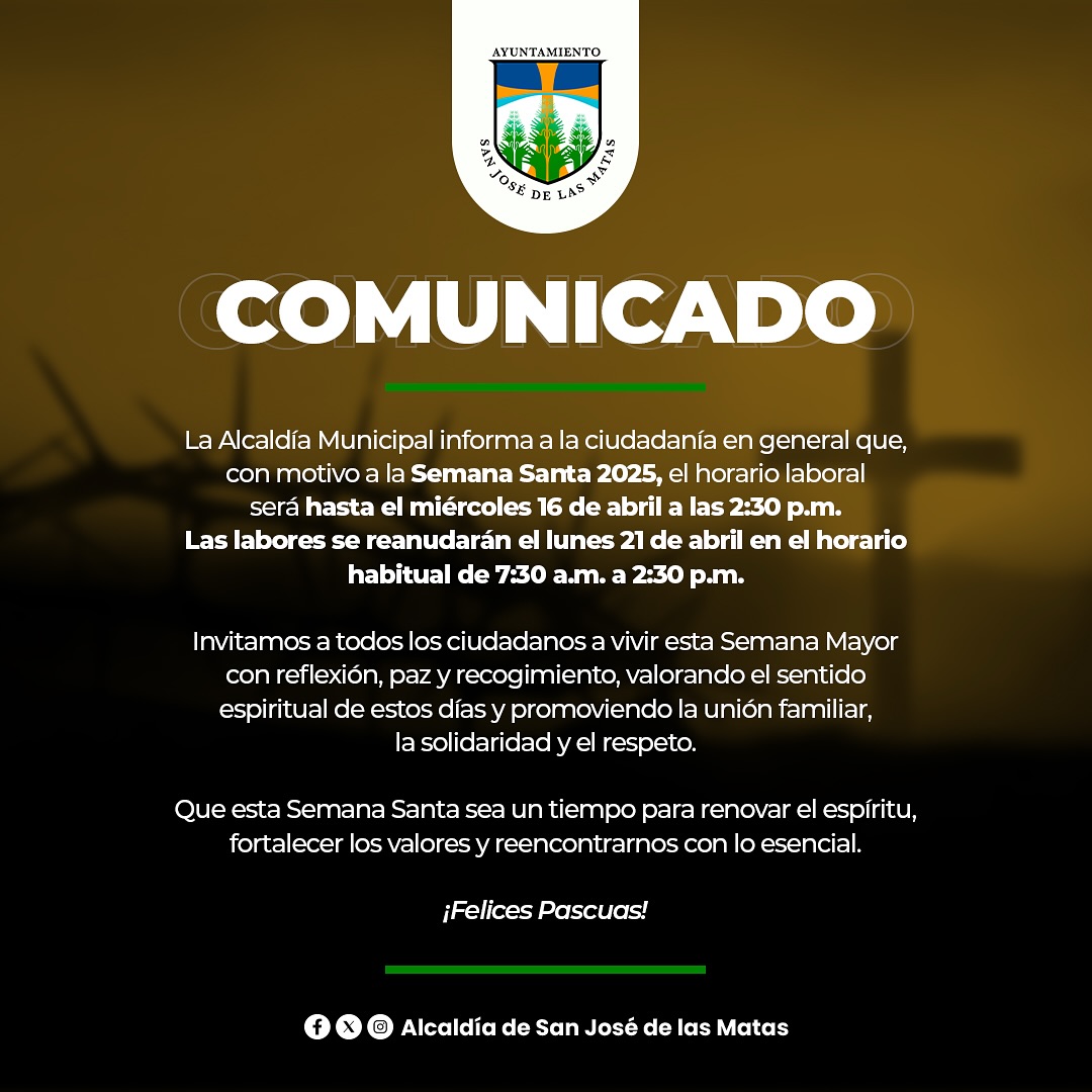 abril 15, 2025 Aviso de horario especial con motivo de la Semana Santa 2025.#AlcaldíadeSanJosédelasMatas #UnaGestiónParaTodos Comparte y Comenta
