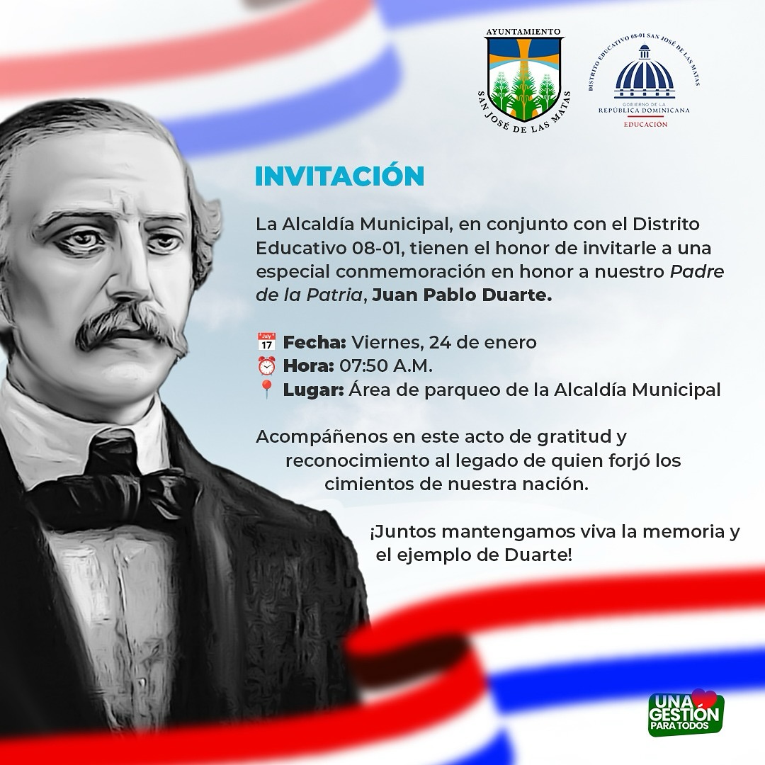 enero 22, 2025 Invitación formal a la sociedad civil para conmemorar el Día de nuestro Padre de la Patria, Juan Pablo Duarte. Comparte y Comenta