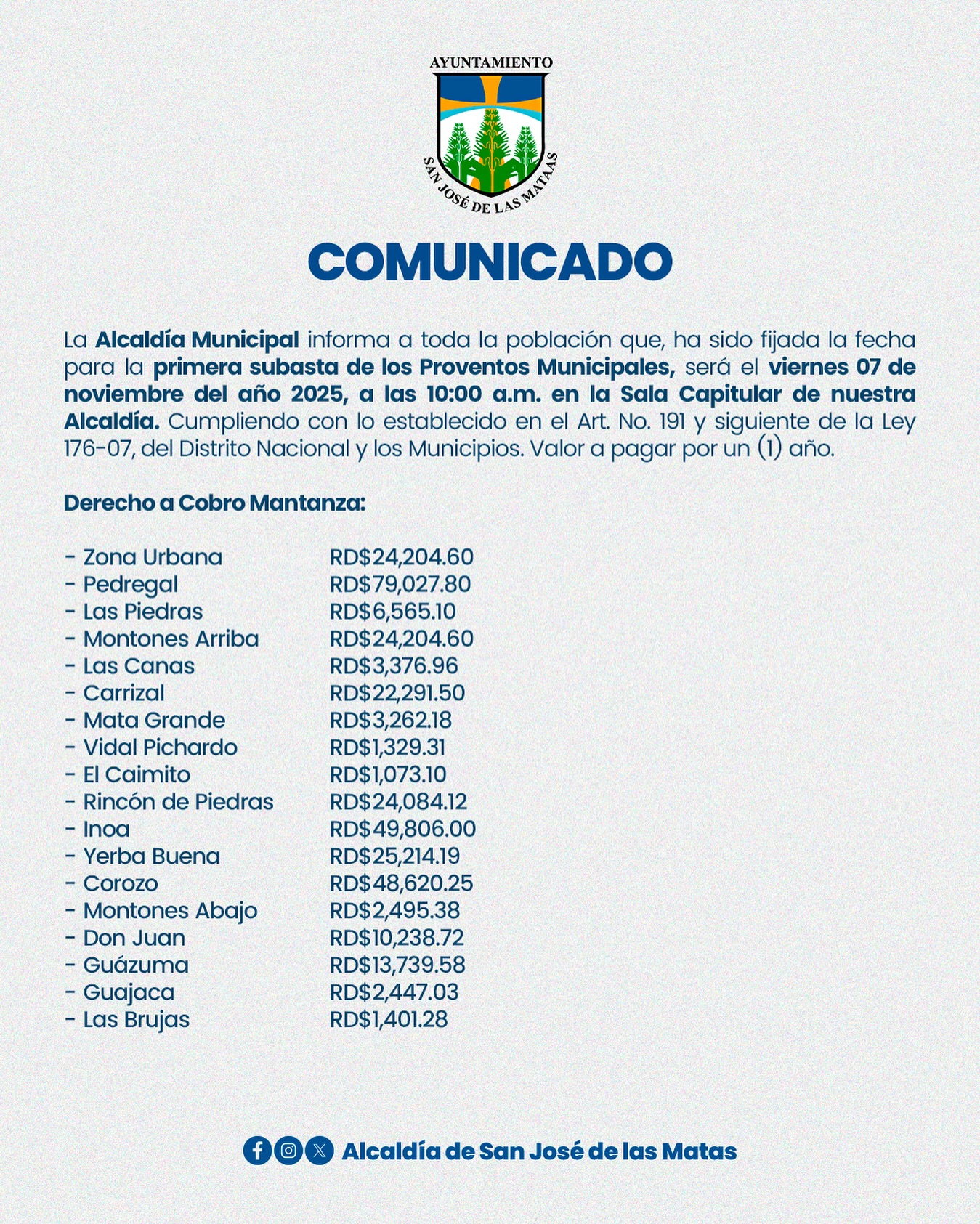 La Alcaldía de San José de las Matas invita a toda la comunidad a participar en la primera subasta de los Proventos Municipales, conforme a lo establecido en la Ley 176-07.