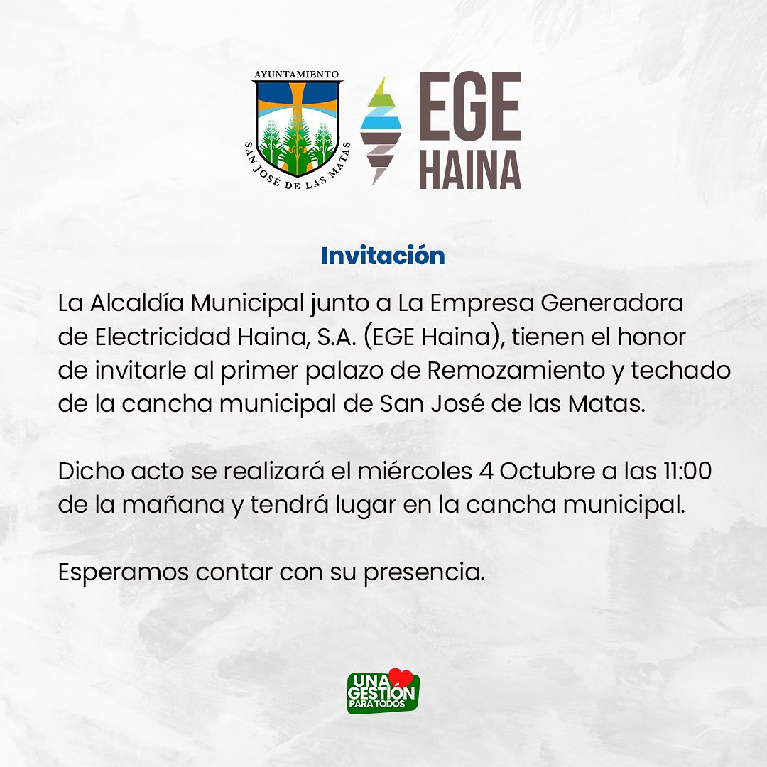 La Alcaldía Municipal, junto a @egehaina, les invita al primer palazo del remozamiento y techado de la nueva cancha municipal. 🗓️