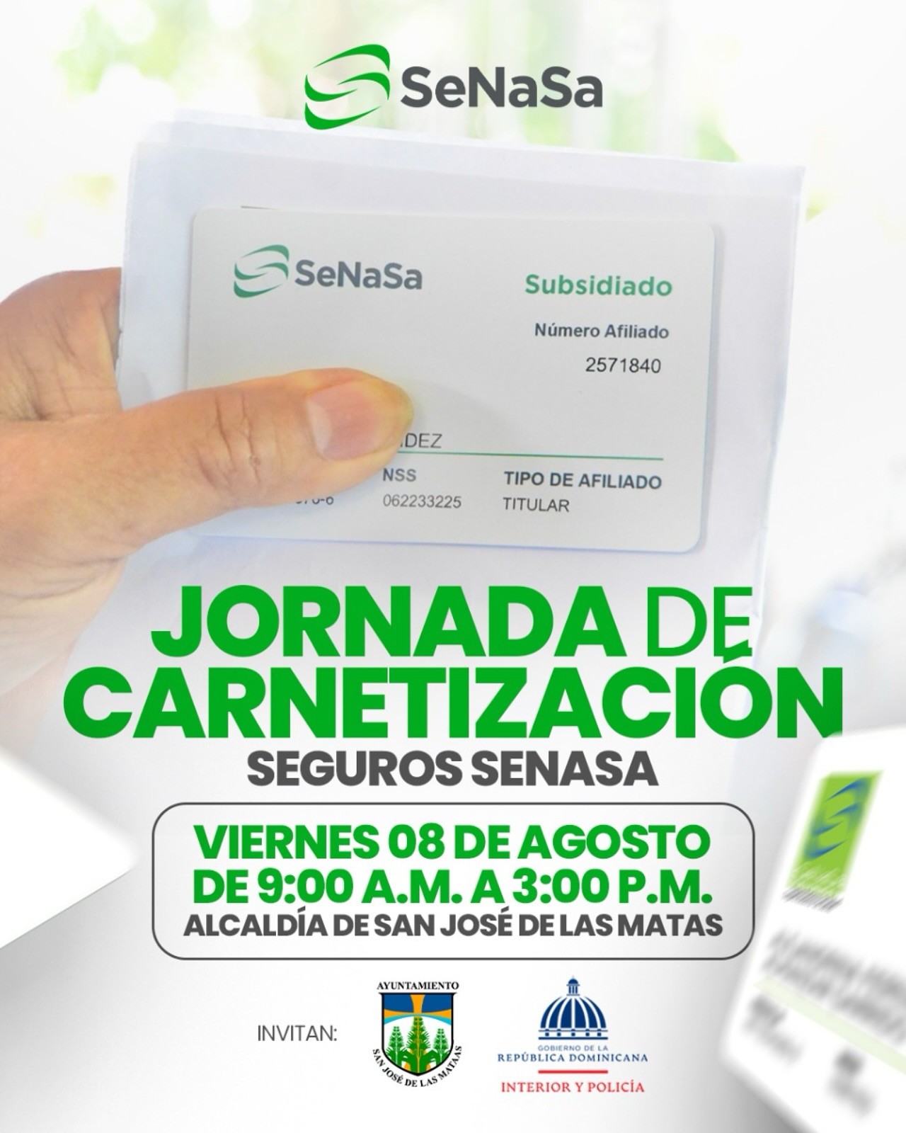 La Alcaldía Municipal, en coordinación con SeNaSa y el Ministerio de Interior y Policía, te invita a participar en la Jornada de Carnetización de Seguros SeNaSa.