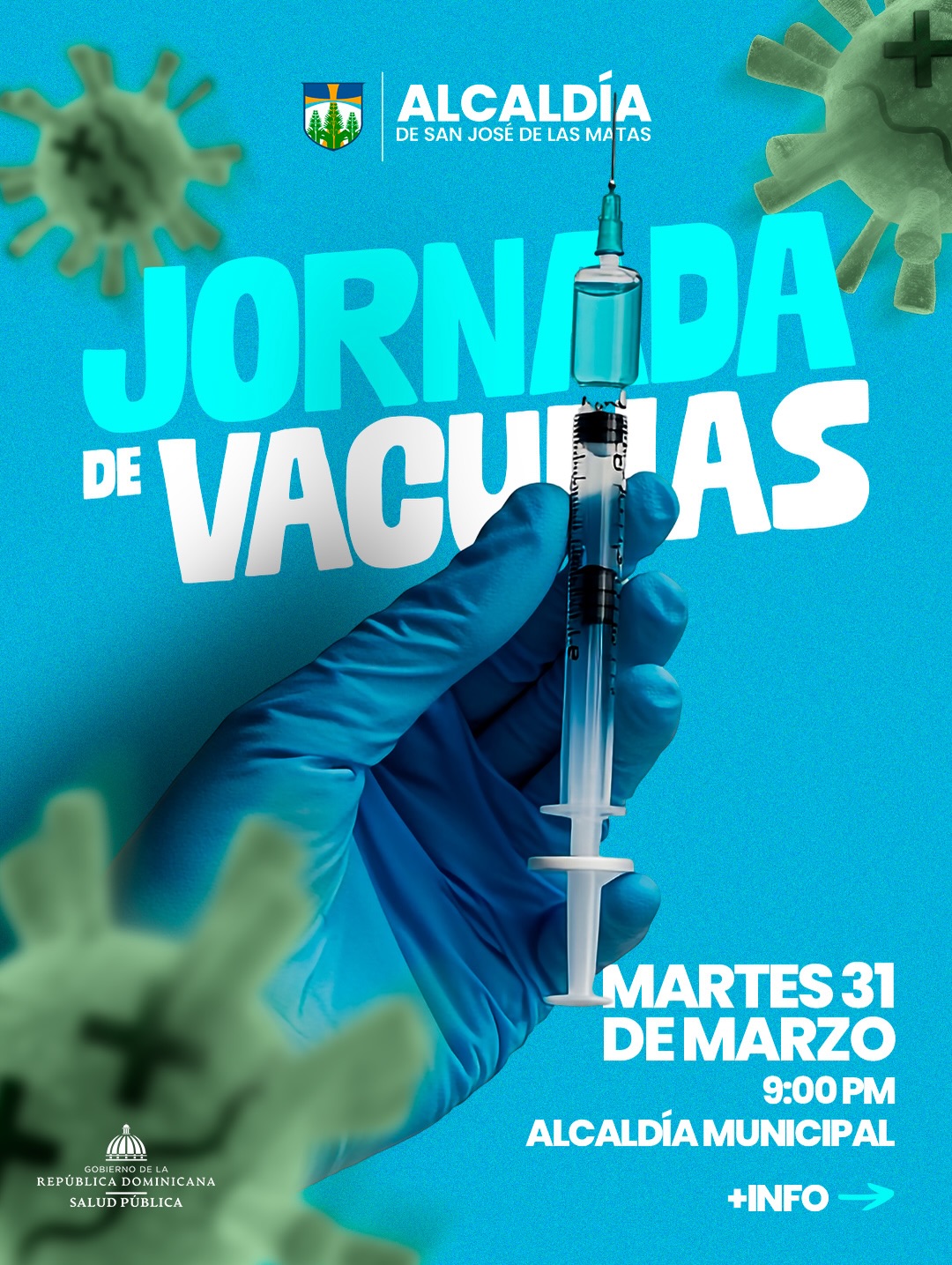 Este martes 31 de marzo a las 9:00 p. m., te esperamos en la Alcaldía Municipal de San José de las Matas para nuestra Jornada de Vacunación.