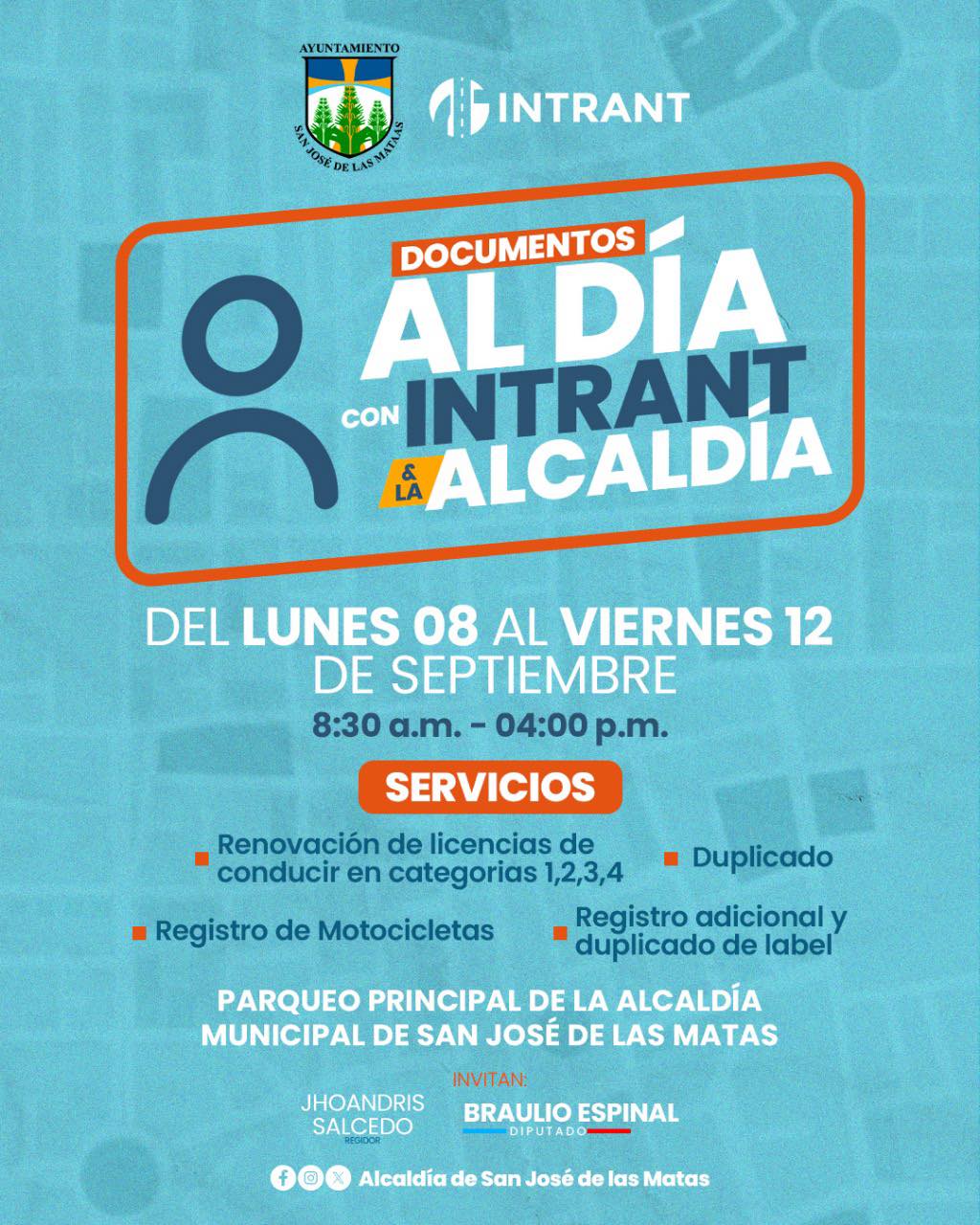 Del lunes 08 al viernes 12 de septiembre, de 8:30 a. m. a 4:00 p. m., el INTRANT y la Alcaldía de San José de las Matas estarán en el Parqueo Principal de la Alcaldía ofreciendo servicios de renovación y duplicados de licencias, registro de motocicletas y más.