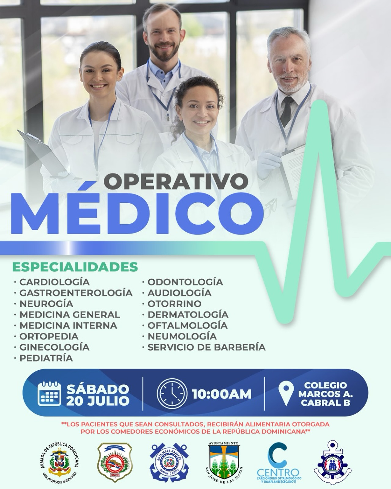 La Alcaldía Municipal, en conjunto con varias instituciones gubernamentales, realizará el próximo sábado 20 de julio a partir de las 8:00 a.m. en el Colegio Marcos A. Cabral B un Operativo Médico donde estarán presentes varios especialistas y doctores en general de la ciencia y la salud. ¡Riega la voz!