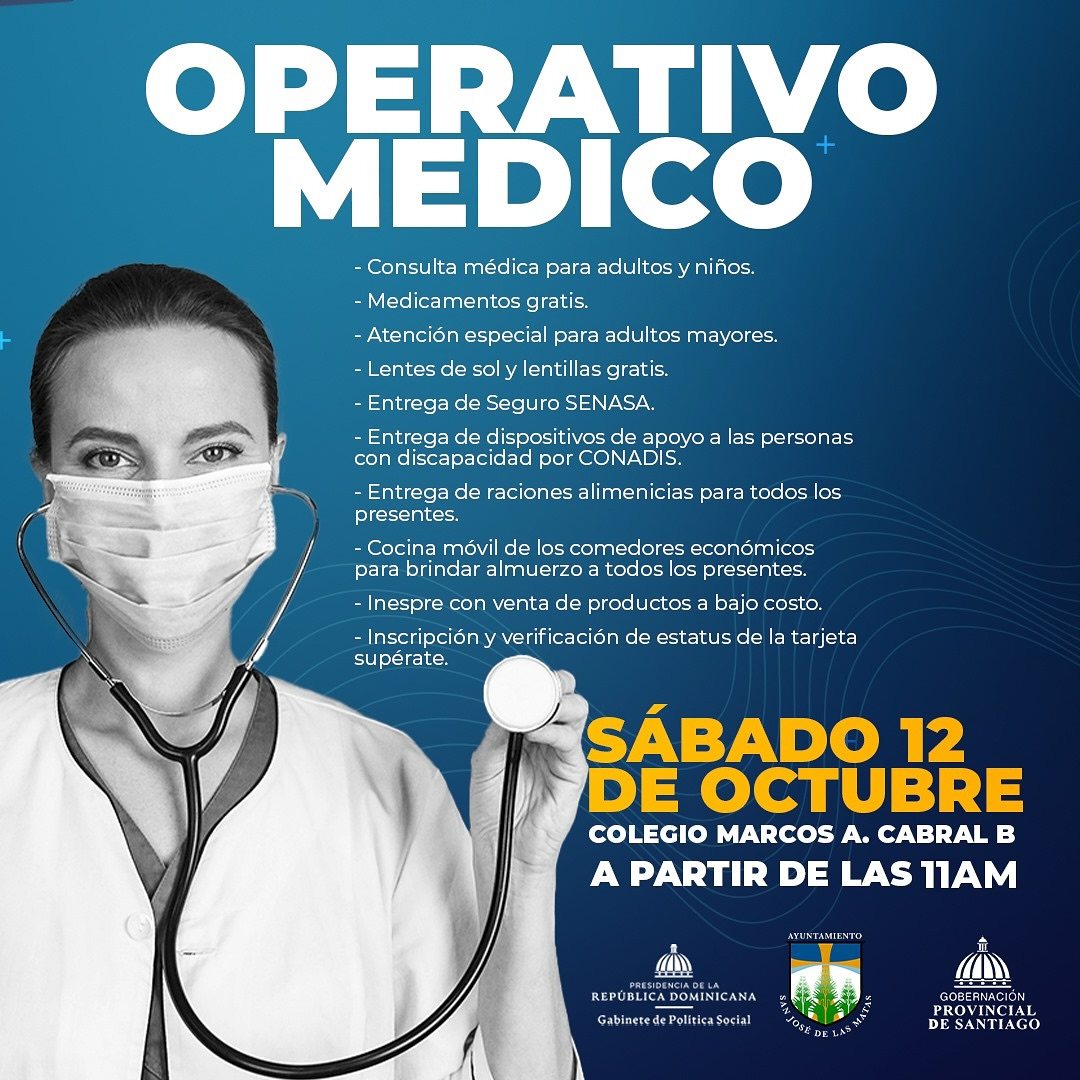 Este próximo sábado 12 de octubre, en unión con el @gabsocialrd y @gobernacionsantiago, estaremos llevando a cabo un Operativo Médico en el Colegio Marcos A. Cabral B. ¡No pierdas esta oportunidad de cuidar tu salud y la de tu familia! Contaremos con servicios médicos gratuitos desde las 11:00 AM. ¡Te esperamos! #SaludParaTodos #OperativoMedico #CuidemosLaSalud