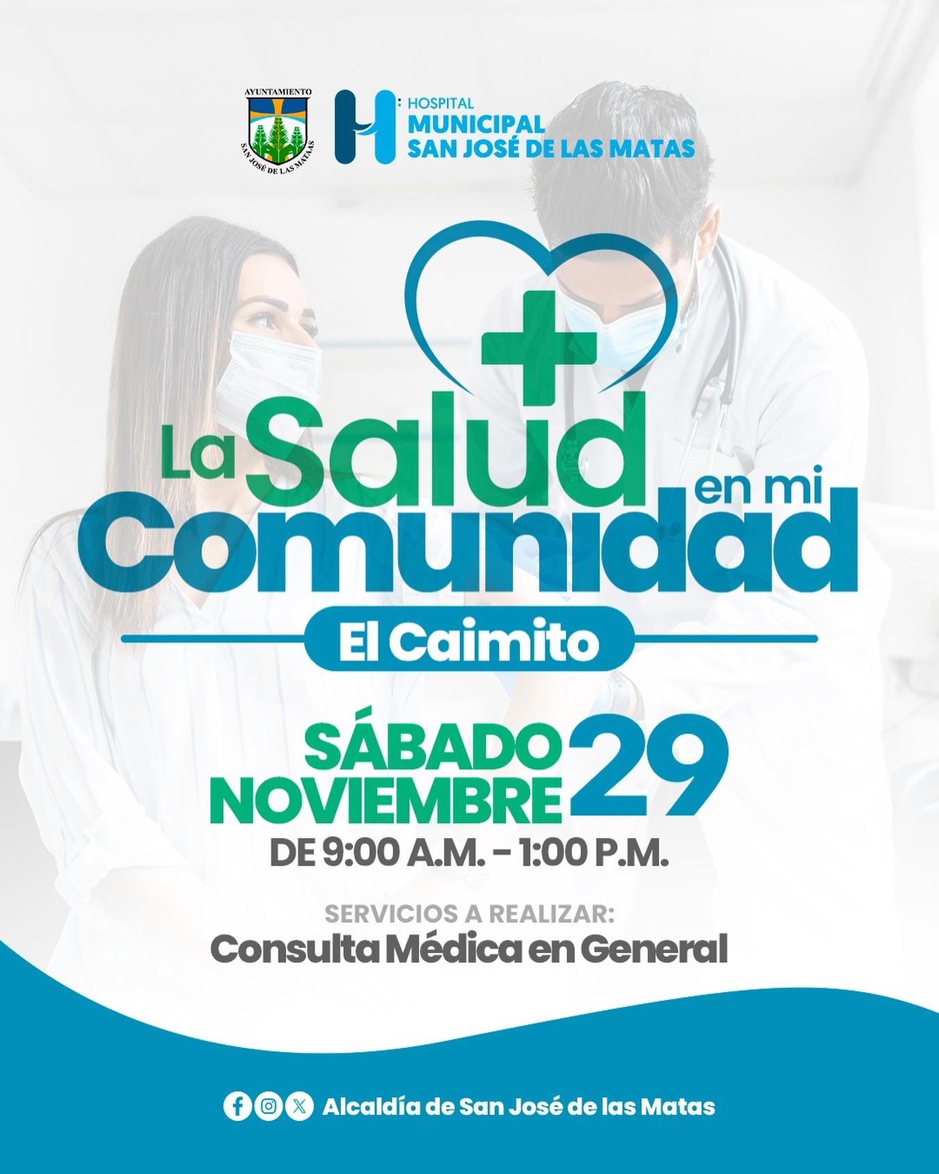 La Alcaldía Municipal de San José de las Matas, en coordinación con el Hospital Municipal, invita a todos los residentes de la comunidad de EL CAIMITO al programa del Operativo Médico “La Salud en mi Comunidad”, este sábado 29 de noviembre de 9:00 a. m. a 1:00 p. m. en el Club Comunal El Caimito.