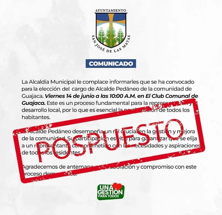 La convocatoria para la elección del cargo de Alcalde Pedáneo en la comunidad de Guajaca queda pospuesta hasta nuevo aviso. Gracias por la comprensión y pedimos disculpas por los inconvenientes que esto pueda causar.